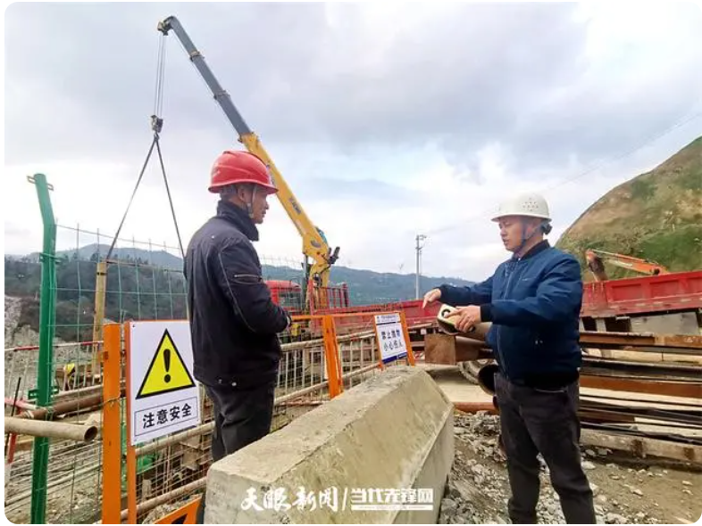 鳳山水庫工程建設管理部工程管理室主任簡杰(右)和工程人員進行施工交流。