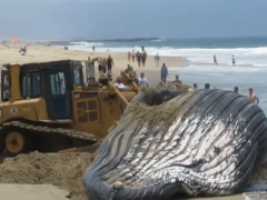 巨大鯨魚擱淺海灘,救援人員用推土機不小心推死!