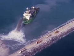 專門為填海所研發(fā)的船,船體直接裂成兩半,泥土砂石全流進海里